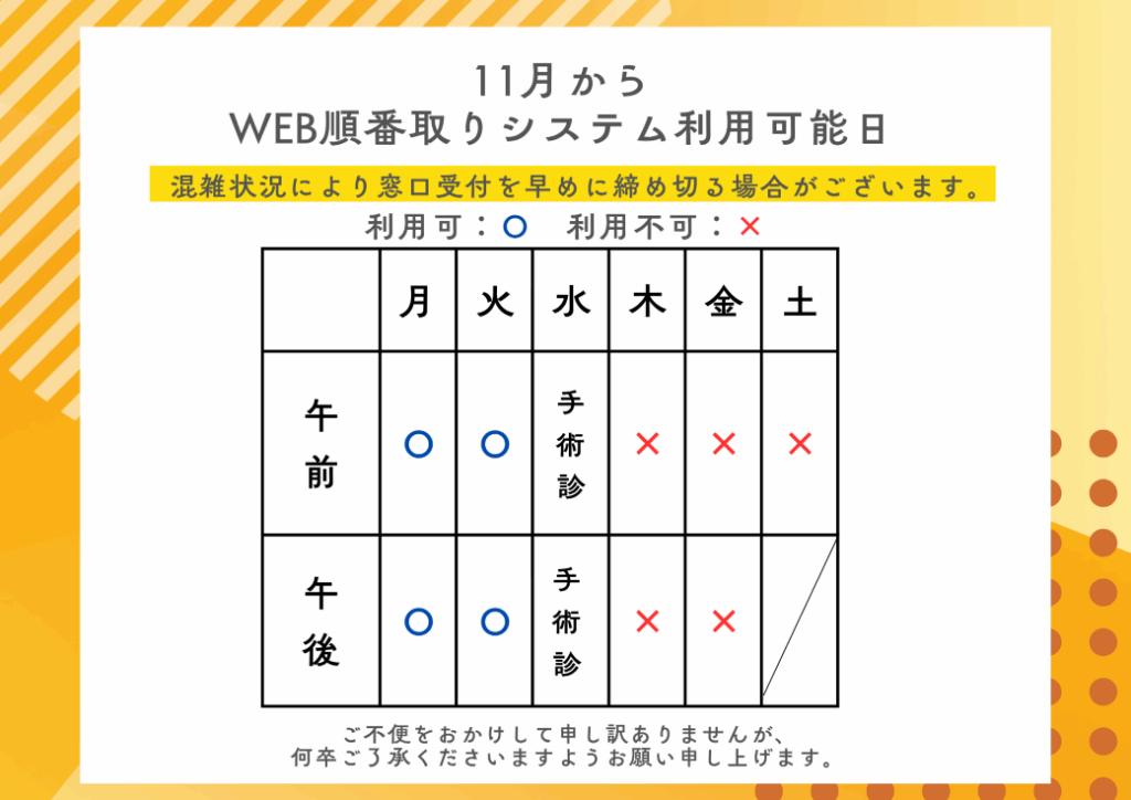 当院は完全予約制ではありませんが、事前に順番をとっていただけるとご案内がスムーズです