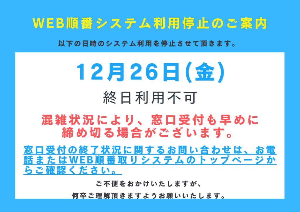 12月26日(金)WEB順番取りシステム利用停止のお知らせ
